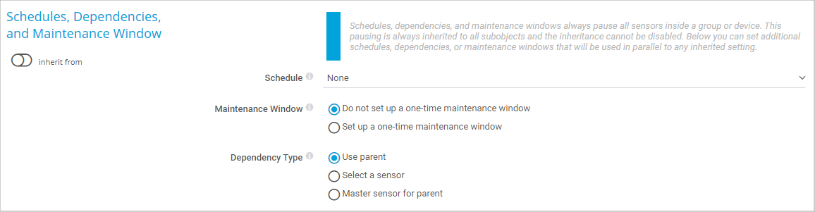 You cannot interrupt the inheritance for schedules, dependencies, and maintenance windows. The corresponding settings from the parent objects are always active. However, you can define additional schedules, dependencies, and maintenance windows. They are active at the same time as the parent objects' settings.