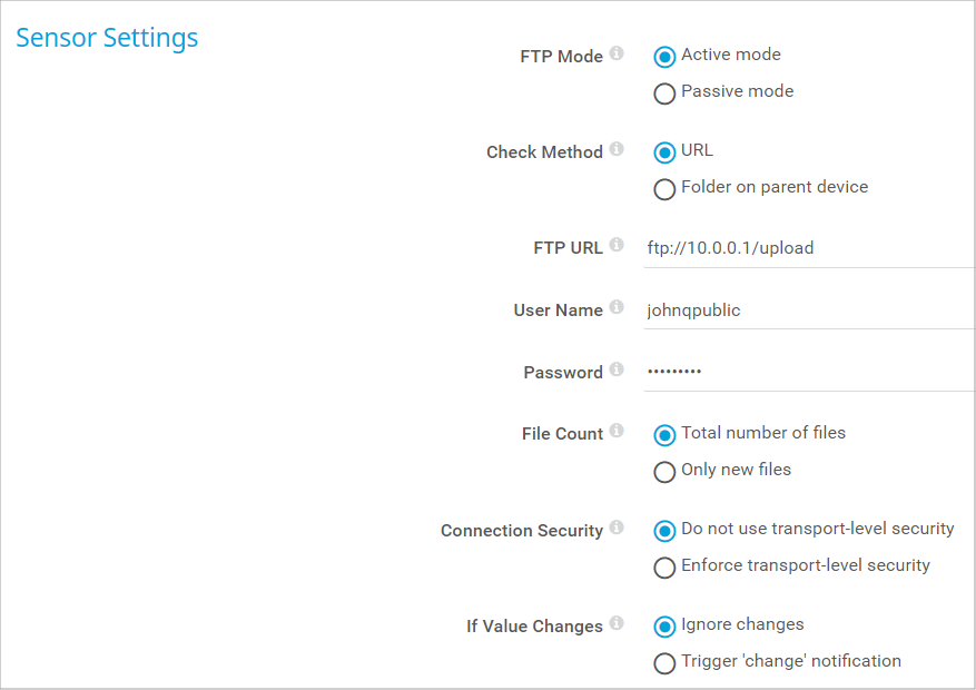 This setting is only visible if you select URL above. Enter the URL that this sensor checks. The URL can look like this: ftp://10.0.0.1/upload