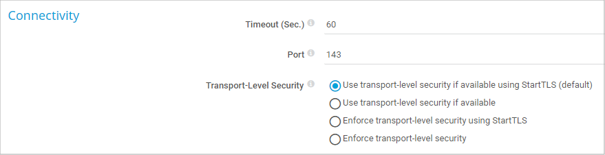 - Use transport-level security if available using StartTLS (default): Try to connect to the server via a Secure Sockets Layer (SSL)/Transport Layer Security (TLS) secured connection and StartTLS. If the server does not support this, the sensor tries to connect without connection security.