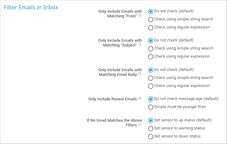 - Set sensor to up status (default): Show the Up status if the sensor does not find any email in the mailbox that matches the filters.