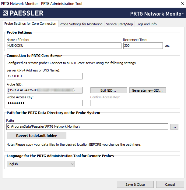 Click Save & Close to confirm your settings and to (re)start the PRTG probe service.