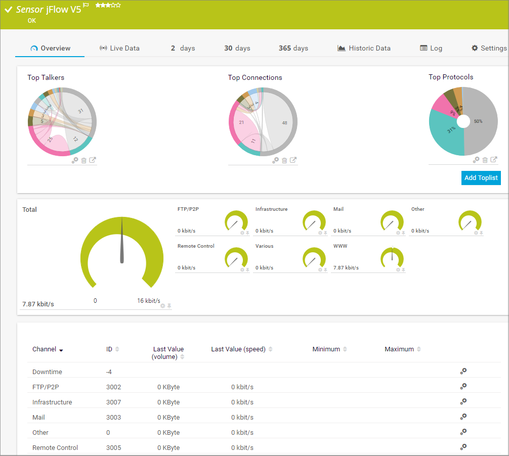 For all Flow (NetFlow, jFlow, sFlow, IPFIX) and Packet Sniffer sensors, Toplists are available on the sensor's Overview tab. Using Toplists, you can review traffic data for small time periods in great detail.