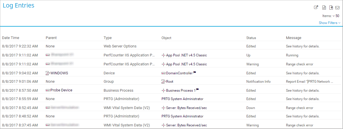 Logs show all past activities and events in your monitoring setup. With the logs, you can, for example, review past user activities, system events, or check whether messages were sent. In a typical setup, a huge amount of log data is produced. Because PRTG records the activity of every single object, you can use this information to check if your setup works as required.