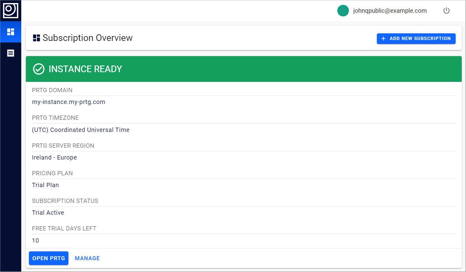 Here you see an overview of your PRTG Hosted Monitor subscription. Click Add New Subscription to upgrade to a commercial subscription, for example. Click Open PRTG to open your PRTG Hosted Monitor instance in the PRTG web interface. Or click Manage to manage your subscription.