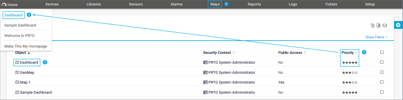 You can also define the priority of a map. Maps with a 5-star priority (i_priority_5) appear in the main menu bar under Home so that you can directly select them. PRTG can show up to 10 entries in the Home menu.