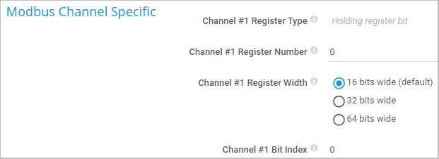 This field is only visible if you select Input register bit or Holding register bit under Channel #x Register Type. Select the width of the value in the register. Choose between: