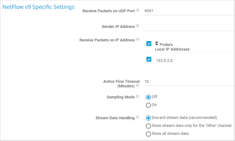 If the target device sends incorrect time information that results in wrong monitoring data, try to use 0 as active flow timeout. This ignores the start and stop information of a flow as provided by the device and accounts all data to the current point in time. It might result in spikes but all data is captured.