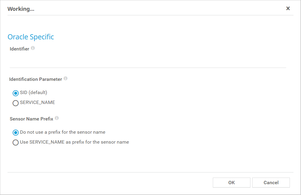 Enter the Oracle System ID (SID) or the SERVICE_NAME of the database that the sensor connects to. Specify the Identification Parameter below. By default, the sensor uses the SID as the connection string.