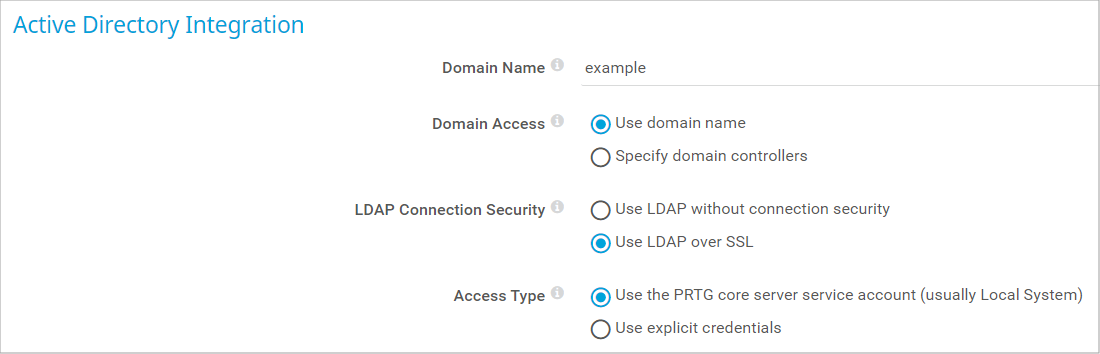 Define which user account PRTG uses to configure Active Directory (AD) access: