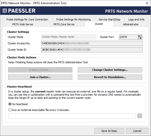 On the Cluster tab, you can change how the PRTG core server behaves in a cluster. Before you change settings here, see section Failover Cluster Configuration.