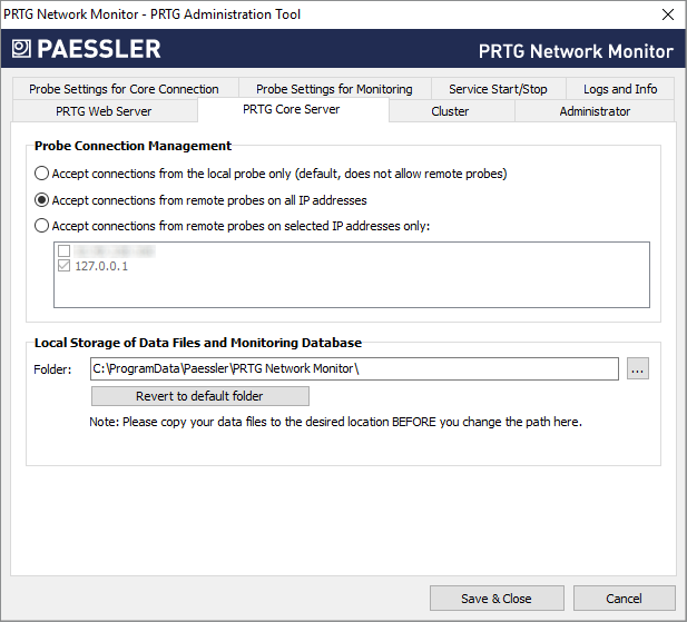 - Accept connections from remote probes on all IP addresses: Accept incoming connections from remote probes, no matter on which IP address of the PRTG core server they come in.