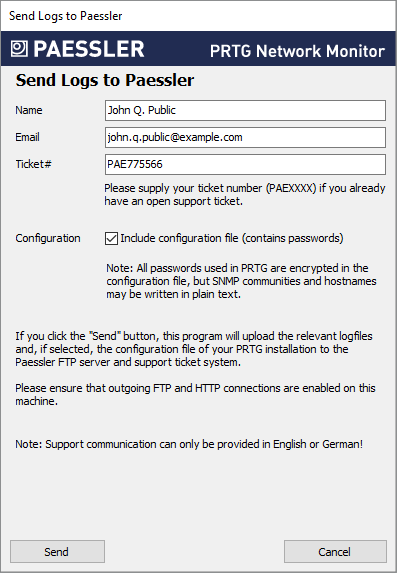 Click Send to start the data upload. PRTG then automatically collects, compresses, and sends your logs to our FTP over SSL (FTPS) server. Ensure that FTPS and HTTP connections are allowed on the remote probe system.