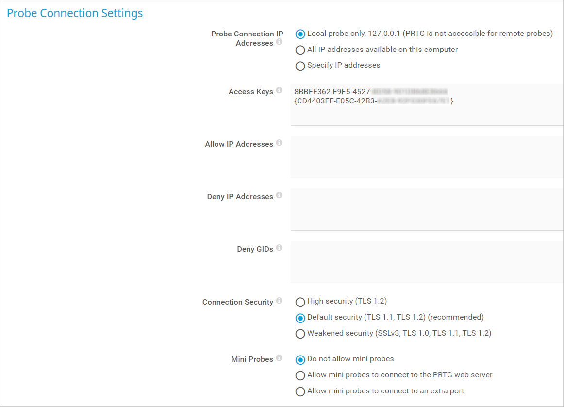 By default, a PRTG core server accepts connections from the local probe only (IP address 127.0.0.1). This setting is the most secure setting, but it does not allow any remote probes to connect to your PRTG core server.
