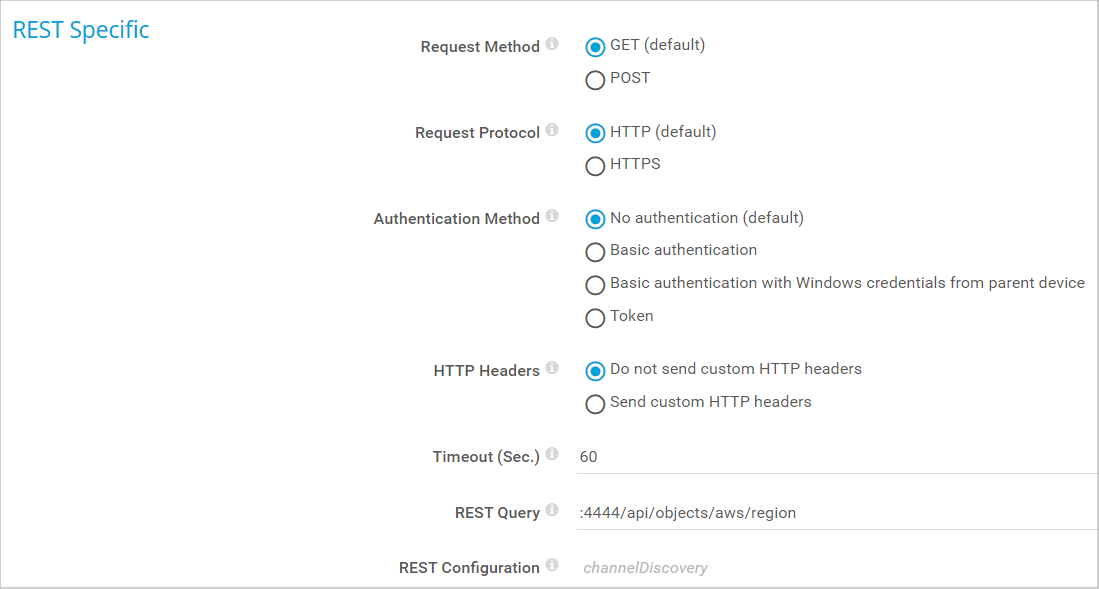 Shows the REST query that this sensor executes. To change it, enter a valid query for the target REST API. The syntax is: [:port]/path[?var1=val1&...]