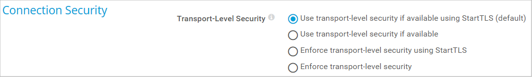 - Use transport-level security if available using StartTLS (default): Try to connect to the server via a Secure Sockets Layer (SSL)/Transport Layer Security (TLS) secured connection and StartTLS. If the server does not support this, the sensor tries to connect without connection security.