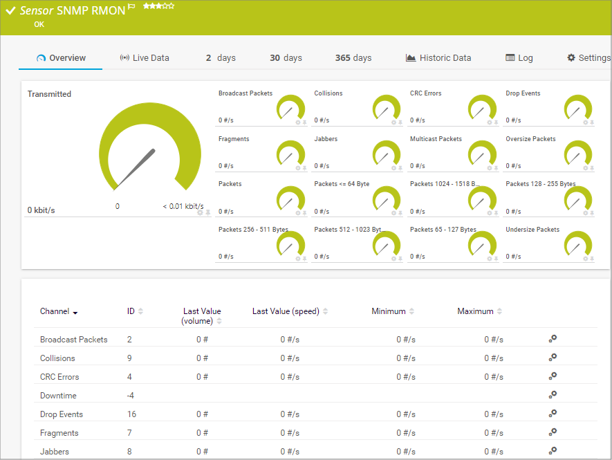 You can create it on an SNMP-compatible device that provides traffic data via RMON. Depending on the data that the device returns, PRTG displays traffic data for each port in different channels, which allows a detailed analysis. If available, the sensor queries 64-bit counters.
