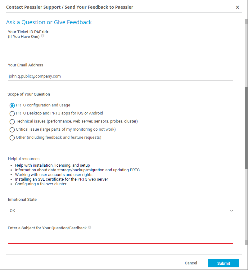 Click Submit to send your request directly to the Paessler support team, or click Cancel to return to the page where you opened the contact form.