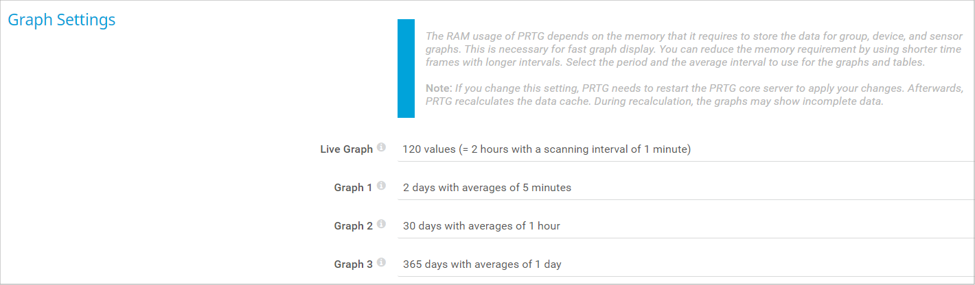 PRTG shows several graphs on the Overview tabs and x Days tabs of objects in the PRTG web interface. PRTG keeps these in RAM for fast graph display. The longer the time frames and the shorter the intervals are, the more memory PRTG uses for this. You can adapt the details for all four graphs. This setting also changes the caption of the graphs and tabs in the PRTG web interface and PRTG Desktop.