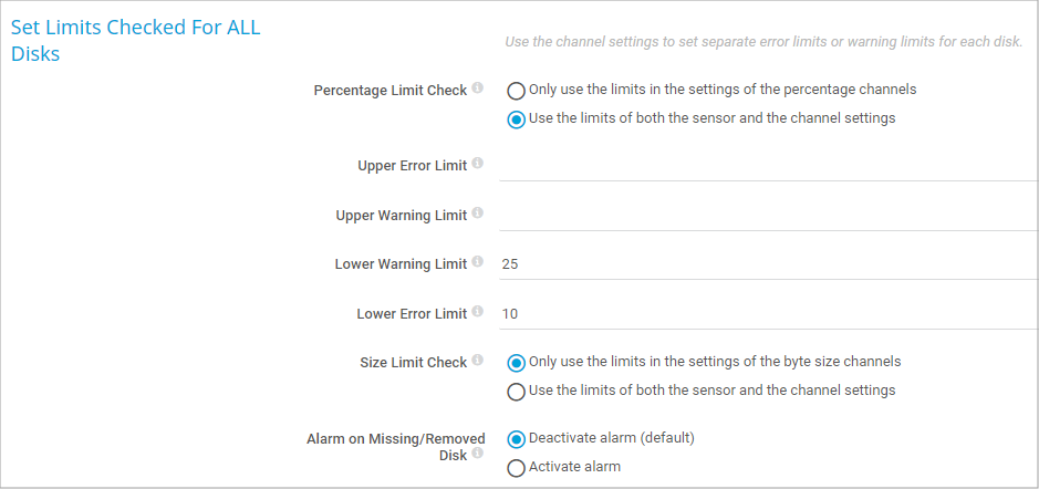 In this section, you can set limits that are valid for all channels and all drives. By entering limits, you can define when the sensor shows the Warning or the Down status, depending on the data provided by all drives that this sensor monitors. If you want to individually define limits for separate channels, use the limit settings in the channel settings.